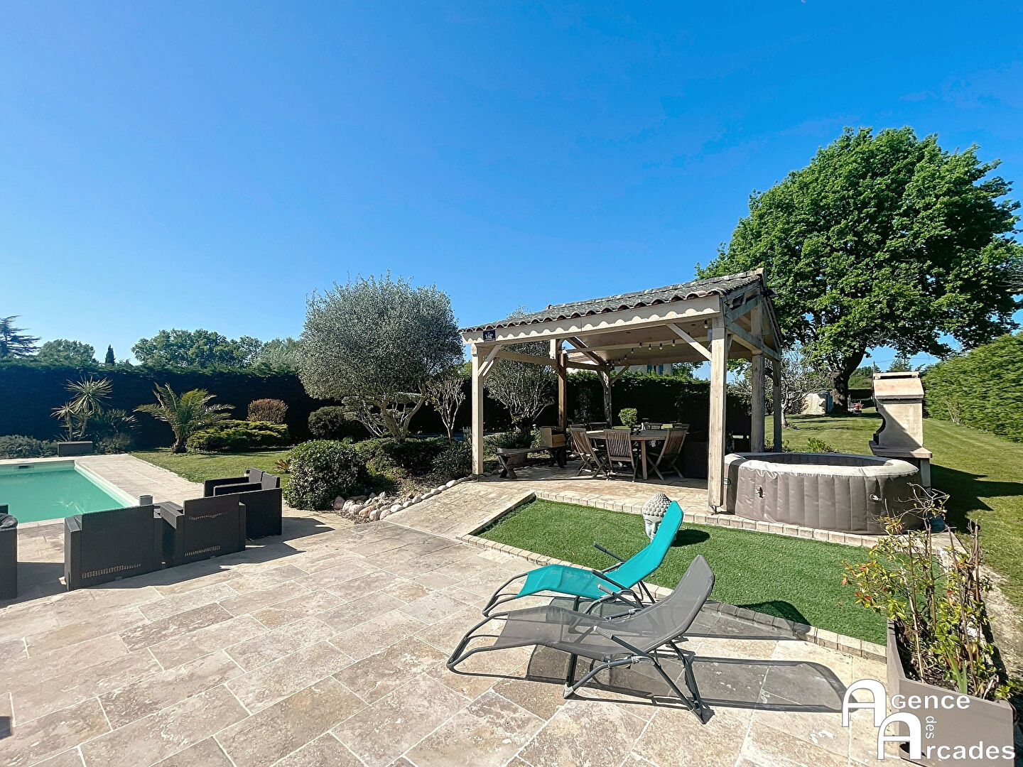 SUPERBE MAISON CONTEMPORAINE de 228 m² avec piscine, confort et tranquillité. Laissez-vous séduire par cette magnifique maison contemporaine, entièrement rénovée en 2023, offrant des prestations haut de gamme et un cadre de vie exceptionnel. Dès l'entrée, spacieuse et élégante, le ton est donné : volumes généreux et lumière omniprésente. Le vaste espace de vie de près de 100 m² accueille un salon convivial avec sa cave murale intégrée, un séjour lumineux, une cuisine ouverte moderne et fonctionnelle ainsi qu'un cellier attenant pour plus de praticité. Côté nuit, la maison dispose de quatre chambres, dont une suite parentale avec salle d'eau privative et dressing, une salle de bains, plusieurs toilettes. Cette habitation possède de nombreux équipements dernière génération : pompe à chaleur air/eau pour un confort optimal, menuiseries aluminium double vitrage, volets roulants électriques avec domotique, alarme et portail motorisé pour la sécurité et le confort. À l'extérieur, profitez d'un terrain clos de 1000 m² environ, parfaitement arboré avec ses oliviers et sa piscine chauffée au sel. Les pelouses sont entretenues par deux robots tondeuses et plusieurs celliers extérieurs permettent le rangement du matériel et des outils. Le tout dans un environnement calme et agréable, en deuxième ligne, sans aucun vis-à-vis. Un bien rare, alliant modernité, confort et sérénité, idéal pour une famille ou pour recevoir en toute convivialité. Coup de coeur assuré. ARCADES PROPRIETES.