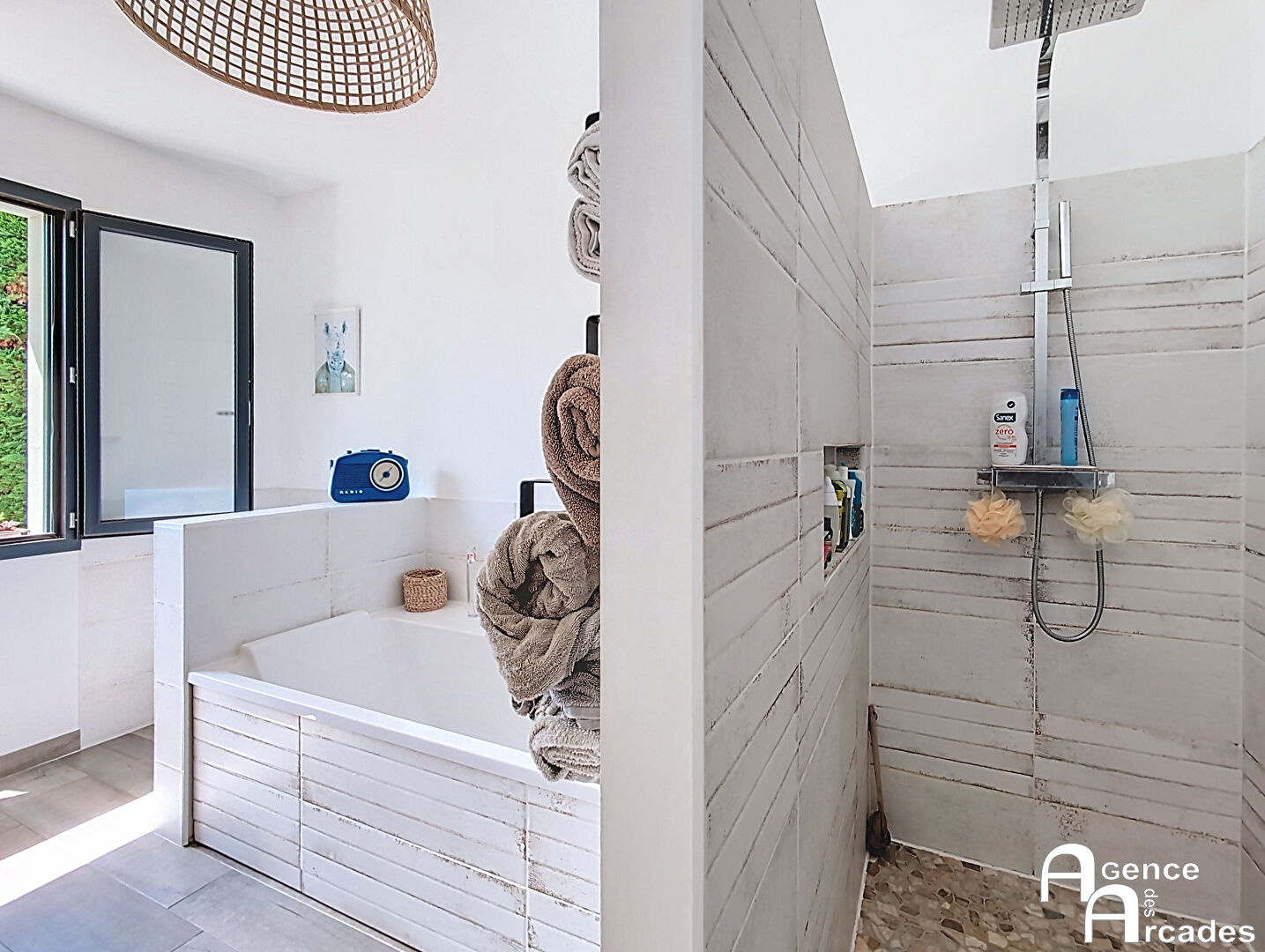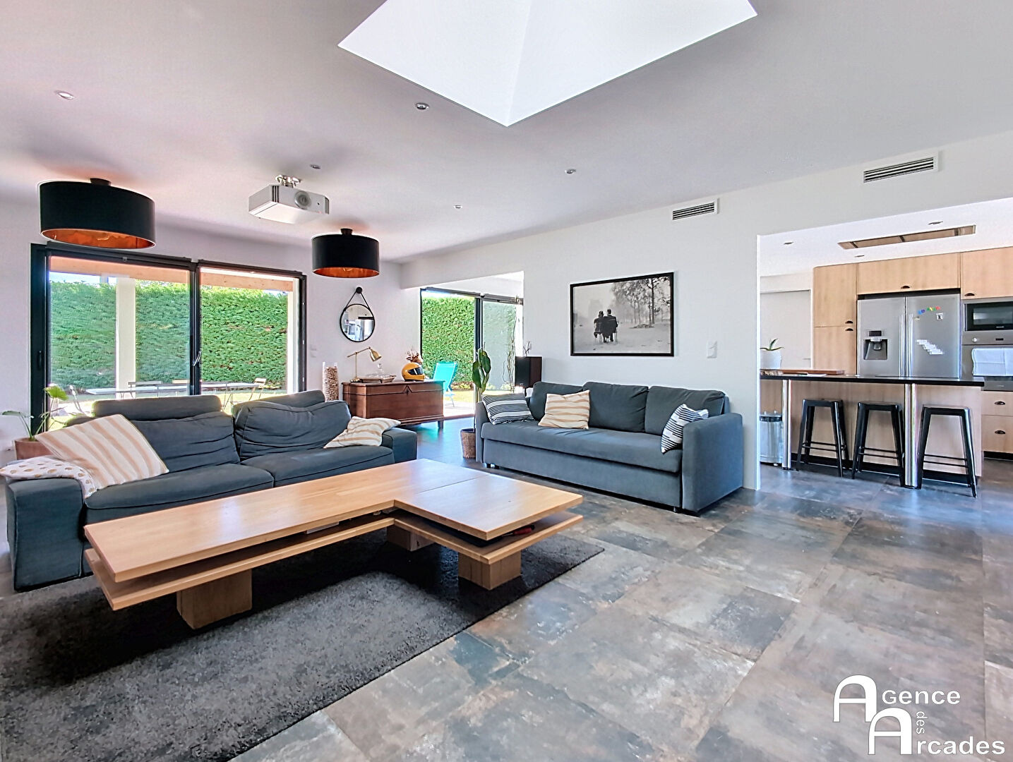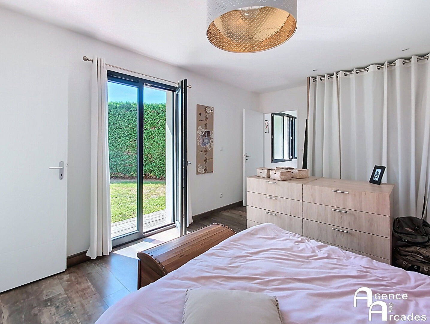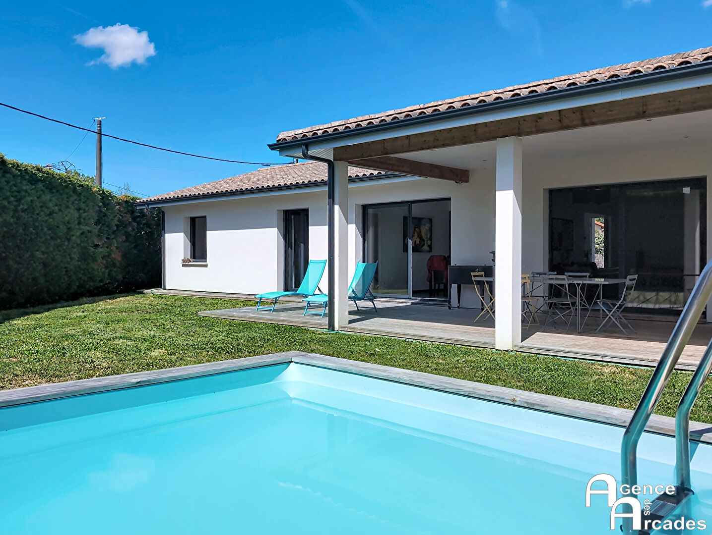 TRES JOLIE MAISON CONTEMPORAINE dans un secteur calme et agréable de St Sulpice et Cameyrac. La maison, édifiée en 2021 ( constructeur IGC) bénéficie de tout le conforme moderne et très économe ( DPE Classe A) et aux normes RT2012. La maison de près de 130m² habitable, comprend un hall d'entrée , un vaste salon , séjour de plus de 60m², très lumineux ouvrant sur 2 terrasses dont une couverte de 22m², une cuisine semi ouverte, très agréable, et espace salle à manger dans le prolongement. La maison dispos d'un cellier, deux chambres , une salle de bains avec douche à l'italienne et baignoire. Chauffage par PAC Air / eau et poêle à bois. La parcelle est entièrement close avec portail électrique, garage indépendant en bois, et piscine semi enterrée. Environnement calme. Maison sous garantie décennale et DO. A seulement 5 min des commerces et de la gare SNCF. AGENCE DES ARCADES - ST SULPICE ET CAMEYRAC ( en face SUPER U).