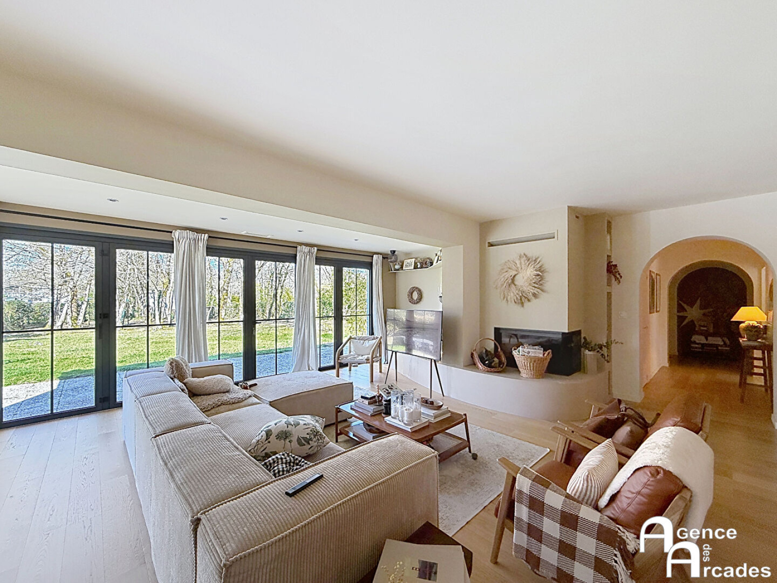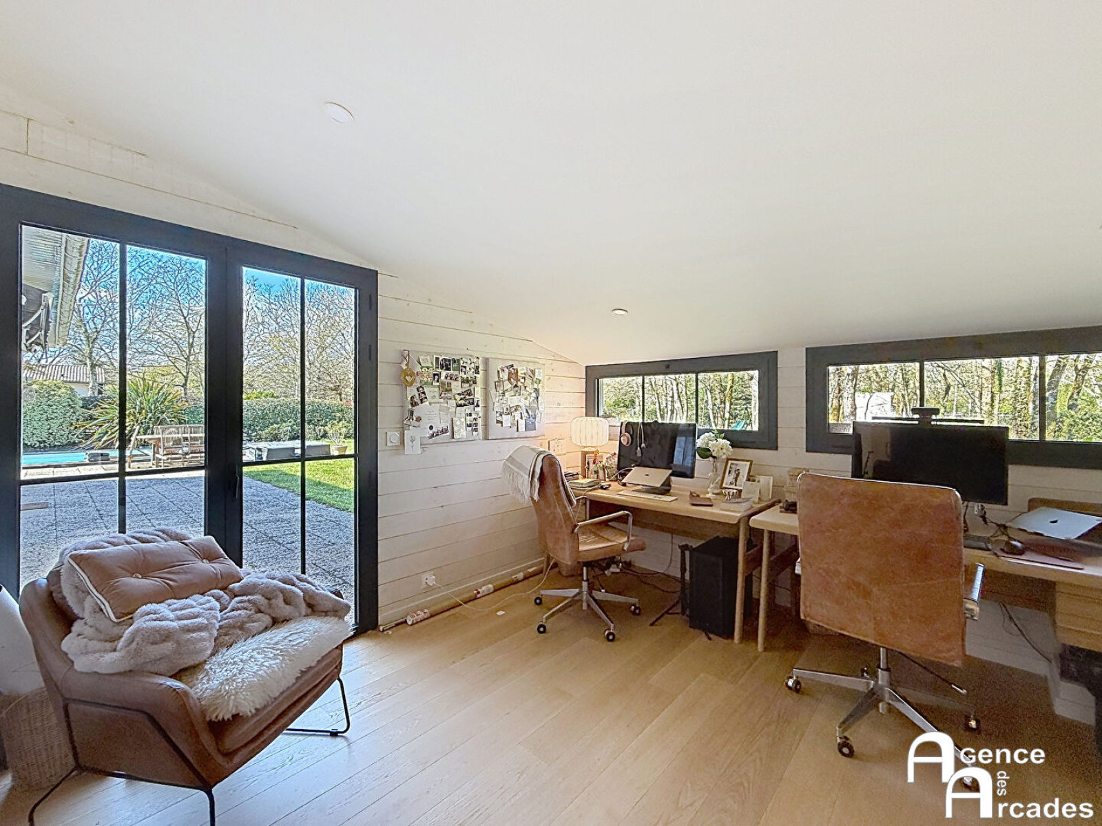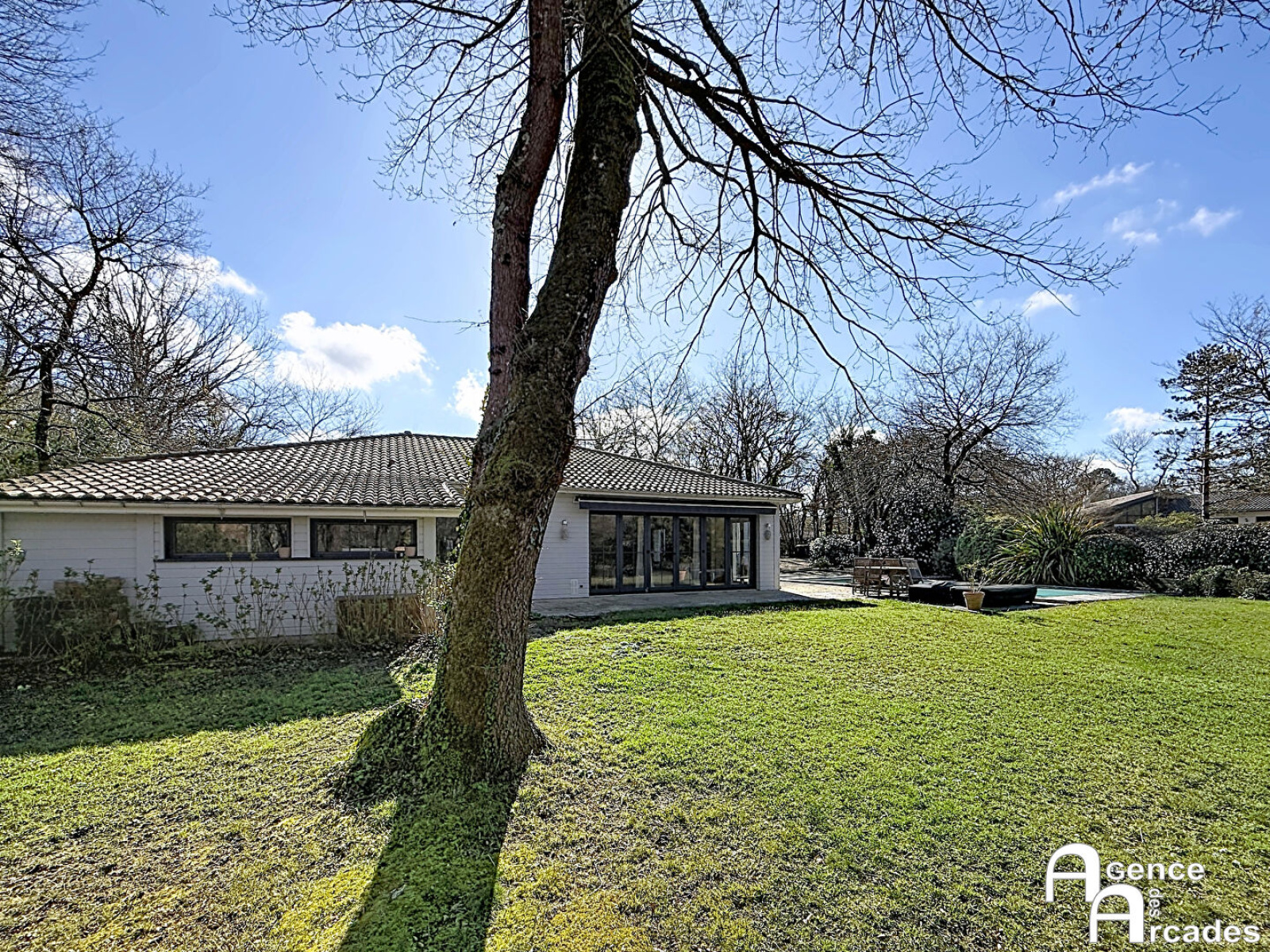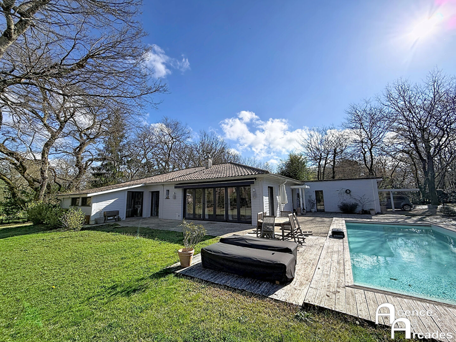 TRES BELLE VILLA entièrement rénovée en 2021 par un architecte sur la prestigieuse résidence du Golf de Saint Sulpice et Cameyrac propose un cadre cosy, élégant et contemporain. Cette habitation comprend un espace de vie chaleureux, raffiné et généreux de près de 70 m² avec entrée, salon - salle à manger, cuisine entièrement équipée et récente. Le premier espace nuit est composé de deux chambres dont une chambre parentale avec sa salle d'eau, d'un très beau dressing, d'un bureau-chambre donnant sur la nature, d'une autre grande salle de douche. Puis, vous trouverez un deuxième espace nuit sous forme de dépendance avec sa chambre, sa salle d'eau et ses toilettes séparées. En complément et attenant à la maison, un cellier-buanderie et un grand atelier de plus de 25 m². Un carport pour deux véhicules, une piscine de 40 m² chauffée et sécurisée, une terrasse extérieure complètent ce bien. Prestations de qualité : parquets chêne, travertin, béton ciré, menuiseries Aluminium, PAC réversible, cheminée 14 KWatts, cuisine équipée et aménagée, panneaux solaire. Parc arboré, paysagé et bien proche de toutes les commodités. ARCADES PROPRIETES.