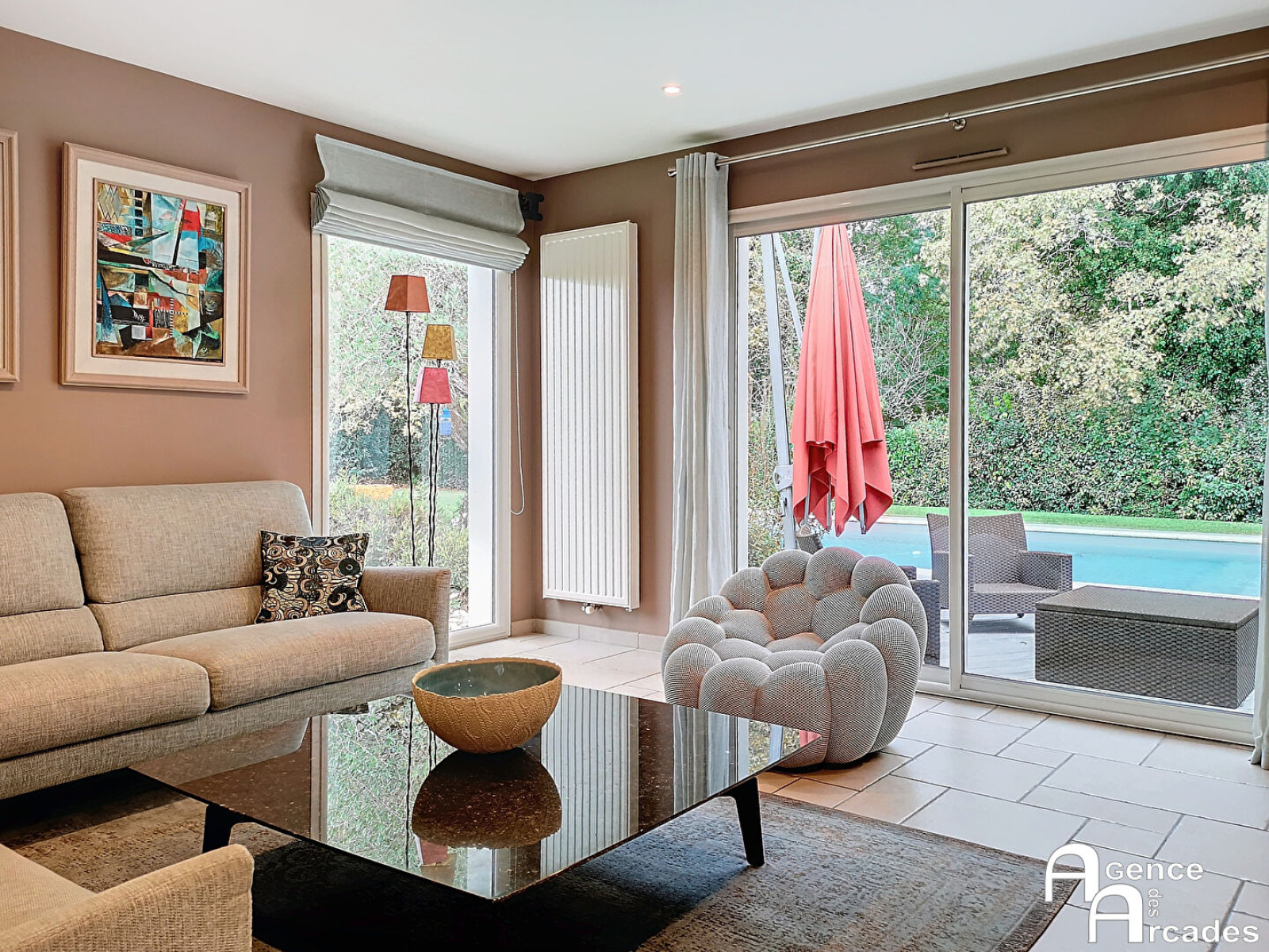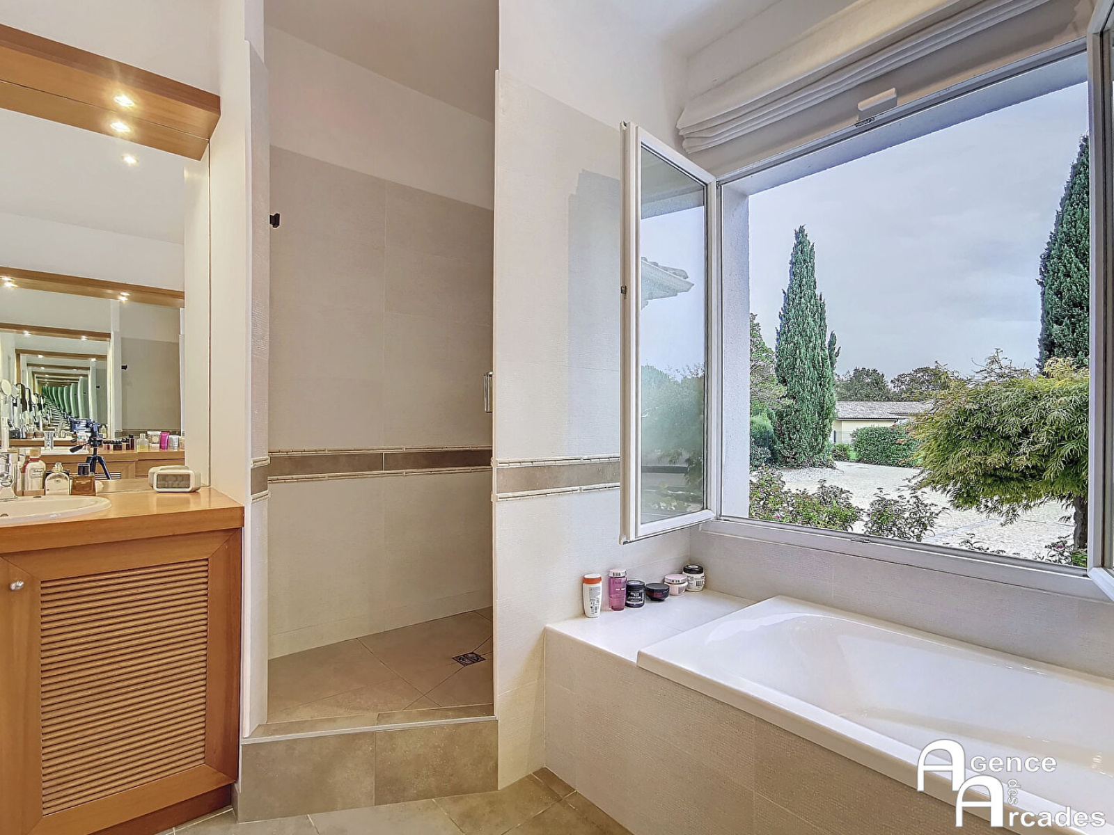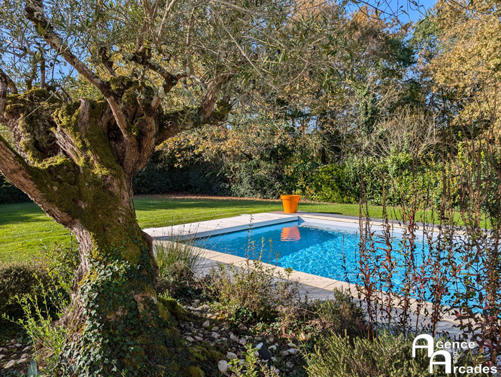ARCADES PROPRIETES agence à St SULPICE ET CAMEYRAC vous présente cette TRES BELLE PROPRIETE comprenant une MAISON DE STYLE Néo Provençal à étage, édifiée sur un jardin paysagé et arboré. La bâtisse de construction récente (2005) aux volumes généreux (343 m² utiles dont 243m² habitables) présente une décoration raffinée et un niveau de confort haut de gamme. Elle dispose d'un agréable hall avec bel escalier en marbre et voûte sarrasine, un spacieux salon séjour, très lumineux (expo Sud Ouest) avec cheminée centrale avec insert, d'une cuisine contemporaine de 25m² réalisée sur mesure avec espace repas et ouvrant sur la terrasse couverte. Une arrière cuisine avec cellier et buanderie permet d'accéder au grand garage double avec rochelle et cave à vin climatisée. La maison dispose également en rez de chaussée d'un bureau et d'une belle suite parentale avec chambre, salle de bains et dressing aménagé. A l'étage, beau palier de 22m², trois belles chambres avec salles d'eau privatives. Prestations de qualité (double vitrages, volets roulants électriques avec commande centralisée, portail electrique, visiophone, alarme, chauffage gaz de ville, cheminée avec insert, puits et arrosage automatique du jardin, très beau dallage de sol et plancher bois dans les chambres). A l'extérieur, de belles terrasse dont une terrasse couverte de près de 30m² avec BBQ, piscine 11x5 avec rideau électrique intégré et abri de jardin. Espace piscine avec vue sur un bois classé. Parcelle entièrement clôturée, accès privatif et possibilité aisée de stationnement de plusieurs véhicules. Environnement très résidentiel et quiétude absolue. Résidence Haut Standing sécurisée du Golf de Bordeaux Cameyrac. Proche des écoles, centre équestre, Golf, Tennis et commerces de proximité. A 15 min de Bordeaux et 15 min de Libourne. AGENCE DES ARCADES de St Sulpice et Cameyrac