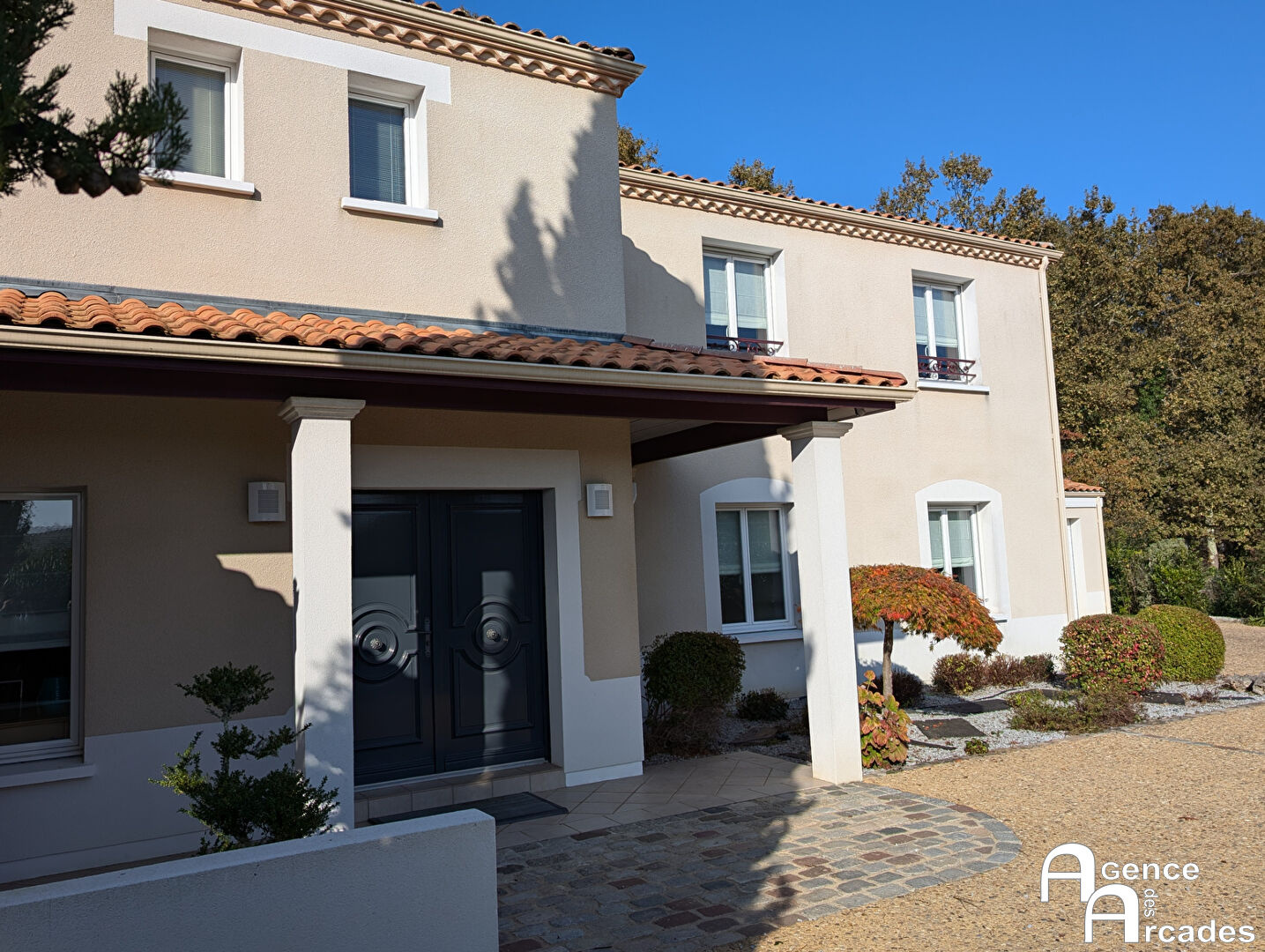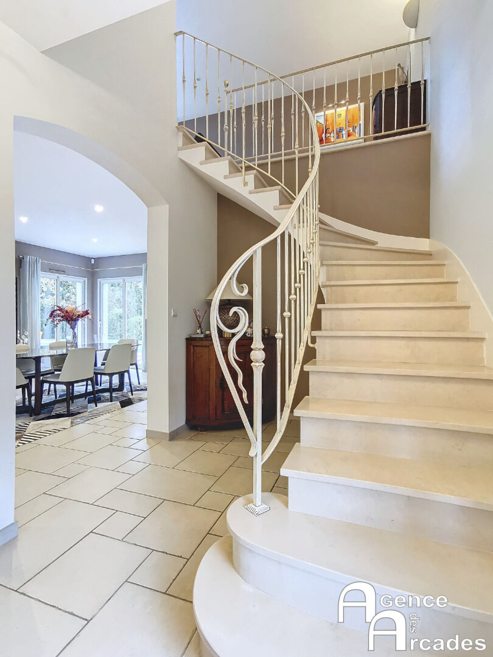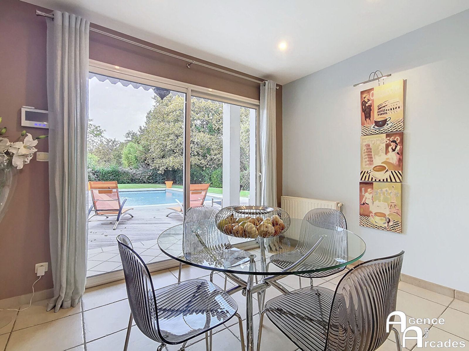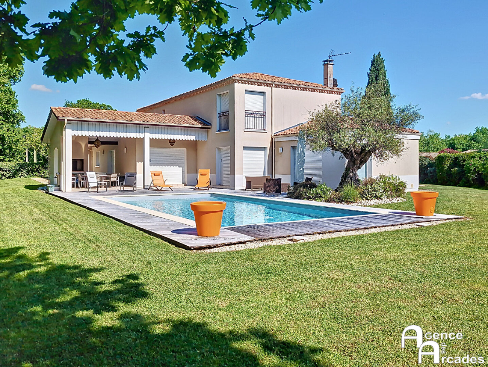 ARCADES PROPRIETES agence à St SULPICE ET CAMEYRAC vous présente cette TRES BELLE PROPRIETE comprenant une MAISON DE STYLE Néo Provençal à étage, édifiée sur un jardin paysagé et arboré. La bâtisse de construction récente (2005) aux volumes généreux (343 m² utiles dont 243m² habitables) présente une décoration raffinée et un niveau de confort haut de gamme. Elle dispose d'un agréable hall avec bel escalier en marbre et voûte sarrasine, un spacieux salon séjour, très lumineux (expo Sud Ouest) avec cheminée centrale avec insert, d'une cuisine contemporaine de 25m² réalisée sur mesure avec espace repas et ouvrant sur la terrasse couverte. Une arrière cuisine avec cellier et buanderie permet d'accéder au grand garage double avec rochelle et cave à vin climatisée. La maison dispose également en rez de chaussée d'un bureau et d'une belle suite parentale avec chambre, salle de bains et dressing aménagé. A l'étage, beau palier de 22m², trois belles chambres avec salles d'eau privatives. Prestations de qualité (double vitrages, volets roulants électriques avec commande centralisée, portail electrique, visiophone, alarme, chauffage gaz de ville, cheminée avec insert, puits et arrosage automatique du jardin, très beau dallage de sol et plancher bois dans les chambres). A l'extérieur, de belles terrasse dont une terrasse couverte de près de 30m² avec BBQ, piscine 11x5 avec rideau électrique intégré et abri de jardin. Espace piscine avec vue sur un bois classé. Parcelle entièrement clôturée, accès privatif et possibilité aisée de stationnement de plusieurs véhicules. Environnement très résidentiel et quiétude absolue. Résidence Haut Standing sécurisée du Golf de Bordeaux Cameyrac. Proche des écoles, centre équestre, Golf, Tennis et commerces de proximité. A 15 min de Bordeaux et 15 min de Libourne. AGENCE DES ARCADES de St Sulpice et Cameyrac