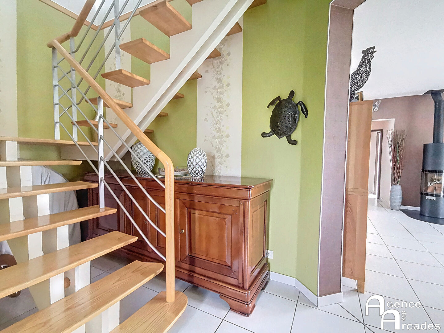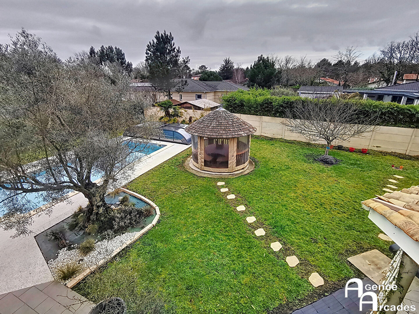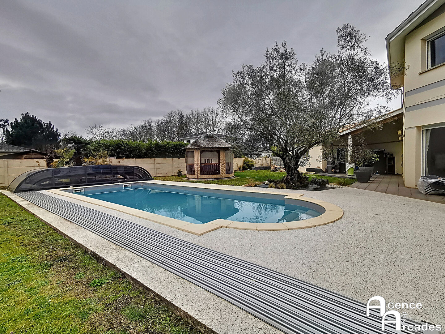À Saint Aubin de Médoc, à 15 km de Bordeaux, 10 km de l'aéroport de Mérignac et 40 km de l'Atlantique, belle propriété d'architecte (2004) sur jardin paysagé de plus de 1 000 m². Entrée spacieuse, séjour lumineux exposé sud ouest avec poêle à bois, cuisine avec coin repas (14 m²) et arrière cuisine/cellier donnant sur le garage. Au rez-de-chaussée : une chambre et une suite parentale avec un dressing et une salle d'eau ; À l'étage : une mezzanine de 18 m², propice à un bureau ou une salle de jeux, et deux chambres pourvues de rangements intégrés. Prestations de qualité : double vitrage, volets roulants électriques, chauffage au gaz de ville, puits pour l'arrosage. L'extérieur :une terrasse d'environ 30 m², une piscine chauffée 9 × 4 m équipée d'un volet électrique et un gazebo en séquoia pouvant accueillir 8 à 10 personnes. Parcelle entièrement close, dans un environnement résidentiel d'une grande quiétude. ARCADES PROPRIETES