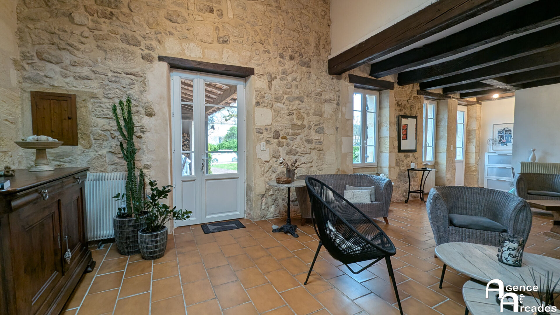 MAISON EN PIERRE DE MOELLONS de plus de 160m² comprenant une pièce de vie avec une salle à manger, un salon de 60m² avec cheminée et poutres apparentes, cuisine attenante donnant sur une terrasse, un cellier, une chambre, une salle de bains avec baignoire ainsi qu'une salle de jeux complète le rez-de-chaussée. A l'étage vous disposerez de deux chambres et une petite chambre mansardée, un espace mezzanine ainsi qu'une salle d'eau avec une douche. Le jardin d'environ700m² est arboré et clôturé, un carport de 50m² une cave et un grenier complète ce bien. Maison parfaitement entretenue et en excellent état. Située à 20 minutes de Bordeaux, et à 5 minutes de l'accès à la voie rapide N89 Bordeaux. AGENCE DES ARCADES