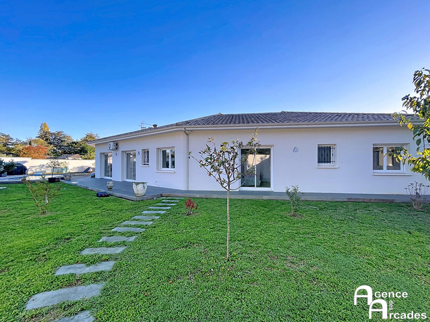 MAISON DE PLAIN PIED et CONTEMPORAINE de 228 m² avec piscine, confort et tranquillité. Laissez-vous séduire par cette magnifique maison contemporaine, entièrement rénovée en 2023, offrant des prestations haut de gamme et un cadre de vie exceptionnel. Dès l'entrée, spacieuse et élégante, le ton est donné : volumes généreux et lumière omniprésente. Le vaste espace de vie de près de 100 m² accueille un salon convivial avec sa cave murale intégrée, un séjour lumineux, une cuisine ouverte moderne et fonctionnelle ainsi qu'un cellier attenant pour plus de praticité. Côté nuit, la maison dispose de quatre chambres, dont une suite parentale avec salle d'eau privative et dressing, une salle de bains, plusieurs toilettes. Cette habitation possède de nombreux équipements dernière génération : pompe à chaleur air/eau pour un confort optimal, menuiseries aluminium double vitrage, volets roulants électriques avec domotique, alarme et portail motorisé pour la sécurité et le confort. À l'extérieur, profitez d'un terrain clos de 1000 m² environ, parfaitement arboré avec ses oliviers et sa piscine chauffée au sel. Les pelouses sont entretenues par deux robots tondeuses et plusieurs celliers extérieurs permettent le rangement du matériel et des outils. Le tout dans un environnement calme et agréable, en deuxième ligne, sans aucun vis-à-vis. Un bien rare, alliant modernité, confort et sérénité, idéal pour une famille ou pour recevoir en toute convivialité. Coup de coeur assuré. ARCADES PROPRIETES.