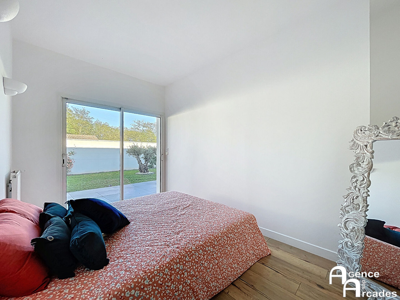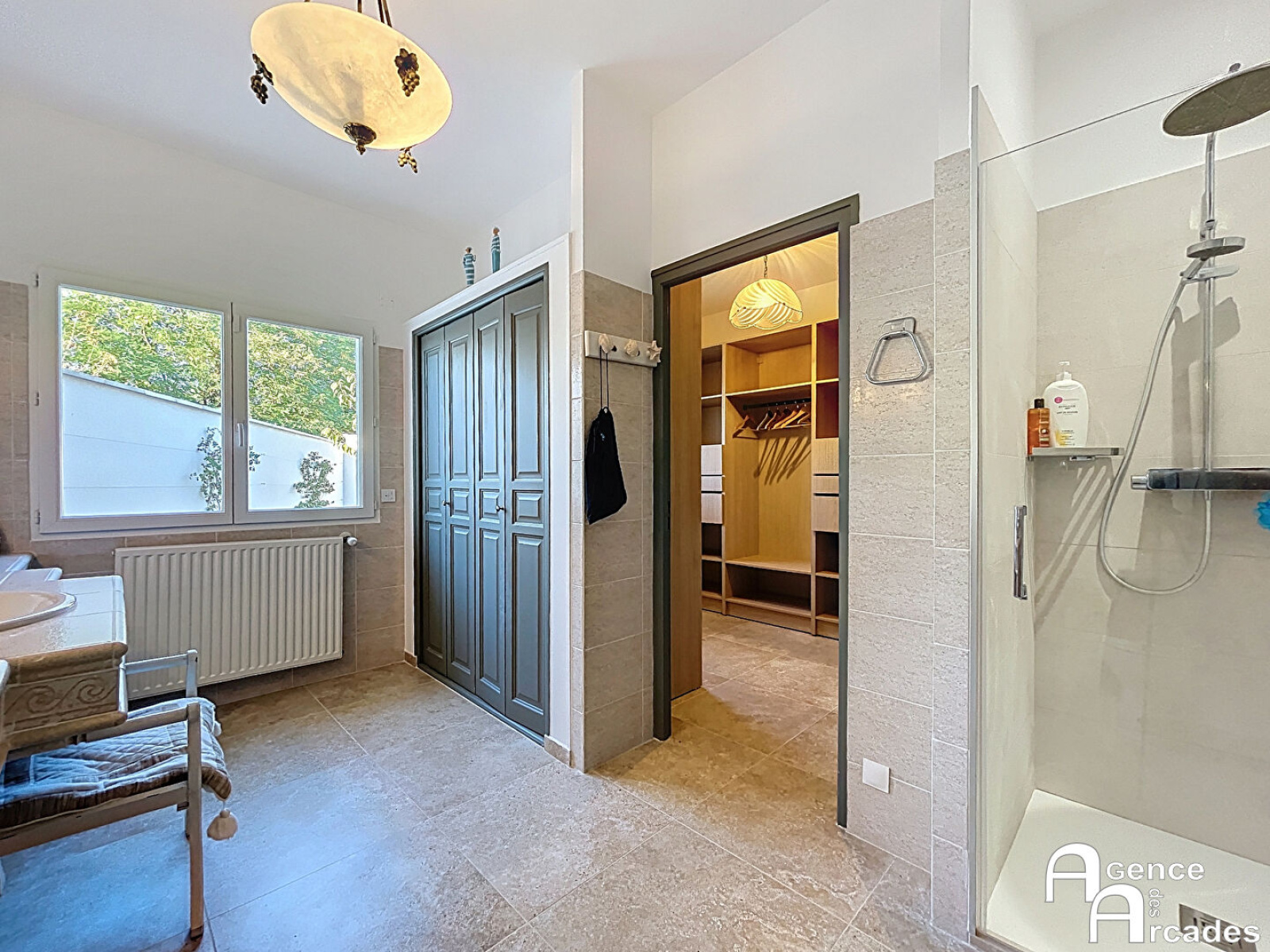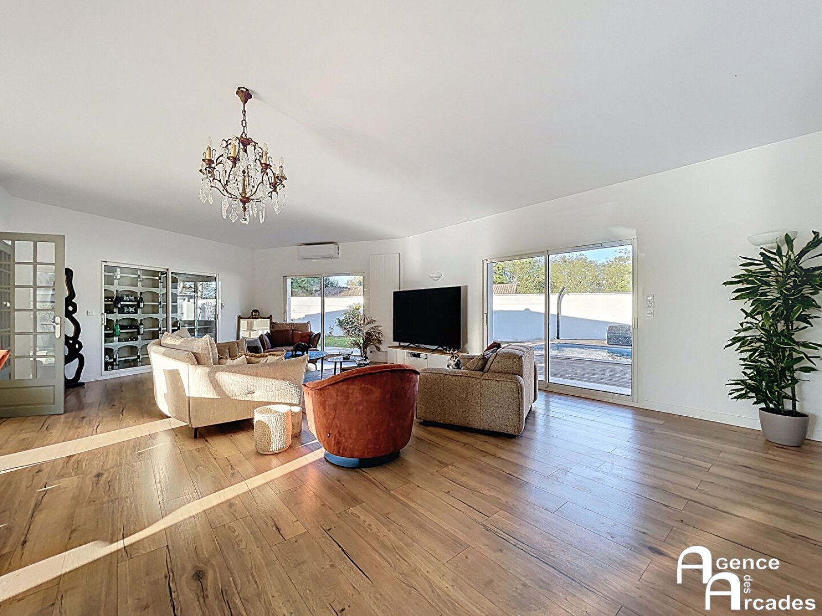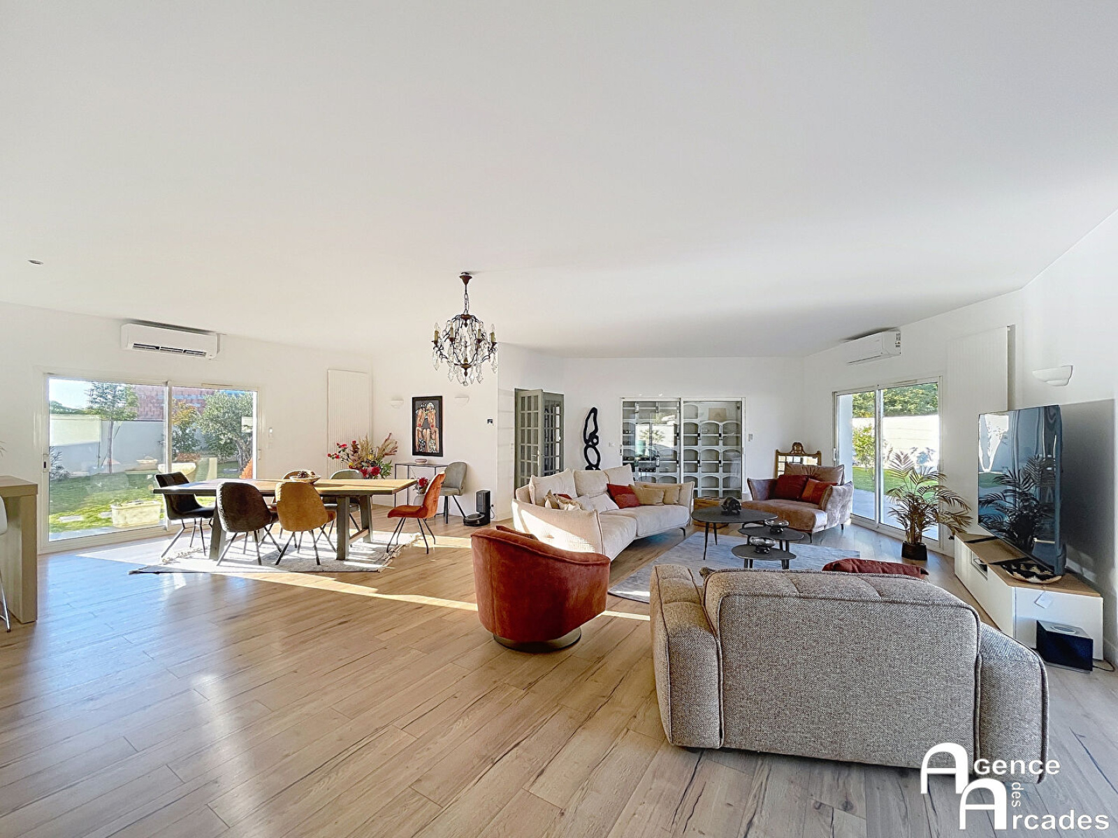 SUPERBE MAISON CONTEMPORAINE de 228 m² avec piscine. Vous recherchez le confort, l'espace et la tranquillité ? Laissez-vous séduire par cette magnifique maison contemporaine, entièrement rénovée en 2023, offrant des prestations haut de gamme et un cadre de vie exceptionnel. Dès l'entrée, spacieuse et élégante, le ton est donné : volumes généreux et lumière omniprésente. Le vaste espace de vie de près de 100 m² accueille un salon convivial avec sa cave murale intégrée, un séjour lumineux, une cuisine ouverte moderne et fonctionnelle ainsi qu'un cellier attenant pour plus de praticité. Côté nuit, la maison dispose de quatre chambres, dont une suite parentale avec salle d'eau privative et dressing, une salle de bains, plusieurs toilettes. Cette habitation possède de nombreux équipements dernière génération : pompe à chaleur air/eau pour un confort optimal, menuiseries aluminium double vitrage, volets roulants électriques avec domotique, alarme et portail motorisé pour la sécurité et le confort. À l'extérieur, profitez d'un terrain clos de 1000 m² environ, parfaitement arboré avec ses oliviers et sa piscine chauffée au sel. Les pelouses sont entretenues par deux robots tondeuses et plusieurs celliers extérieurs permettent le rangement du matériel et des outils. Le tout dans un environnement calme et agréable, en deuxième ligne, sans aucun vis-à-vis. Un bien rare, alliant modernité, confort et sérénité, idéal pour une famille ou pour recevoir en toute convivialité. Coup de coeur assuré. ARCADES PROPRIETES.