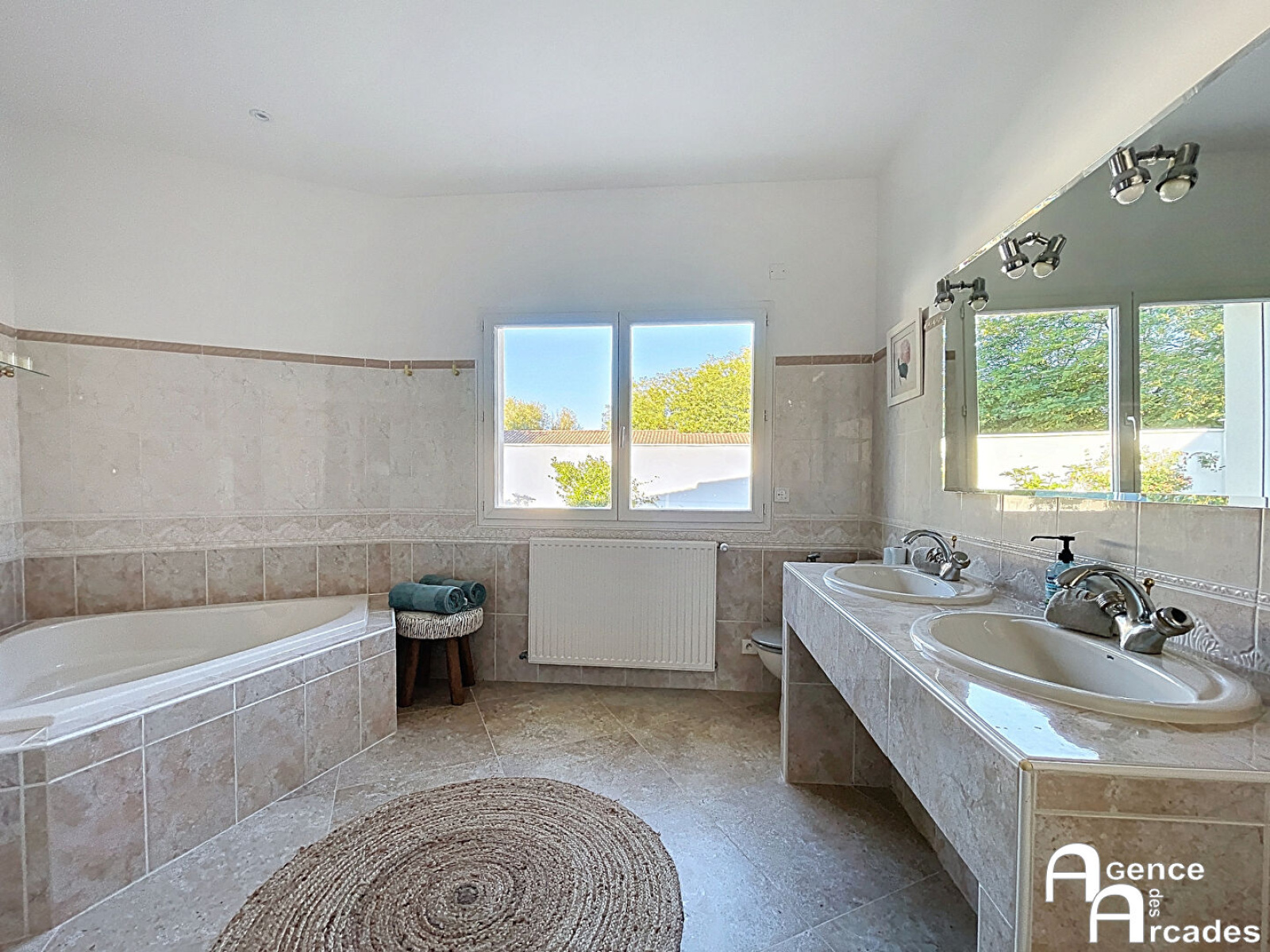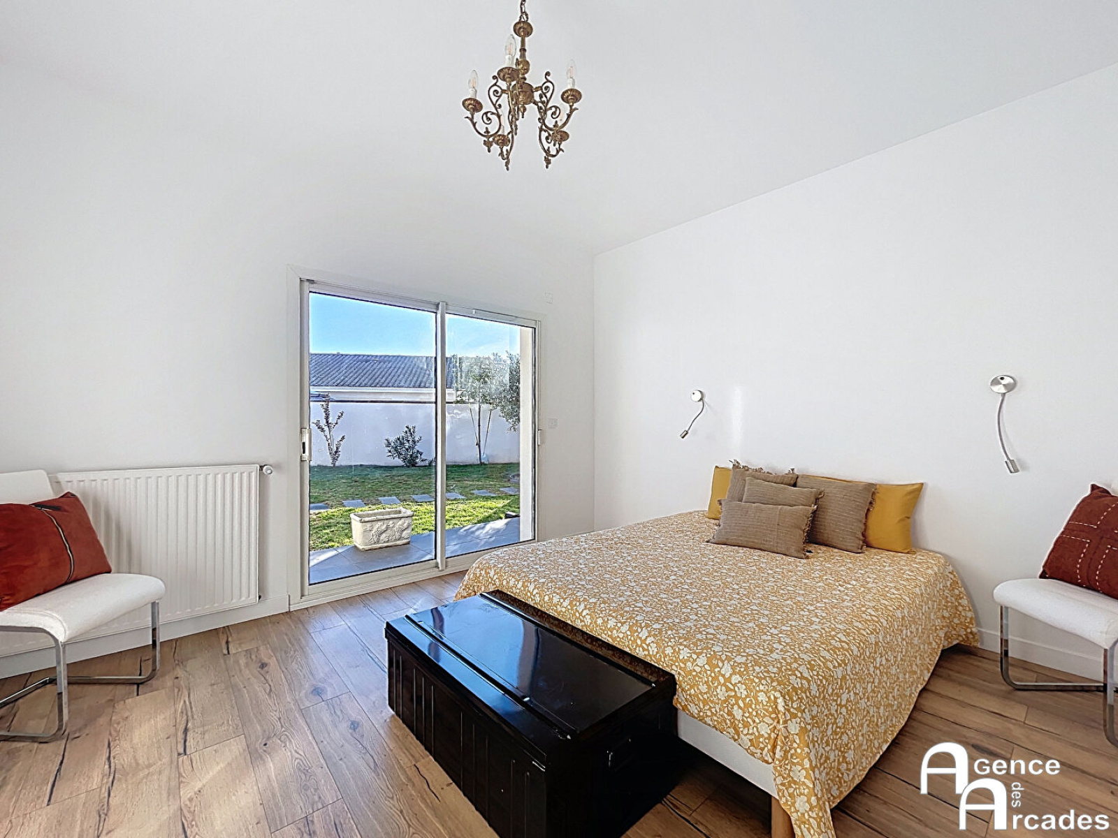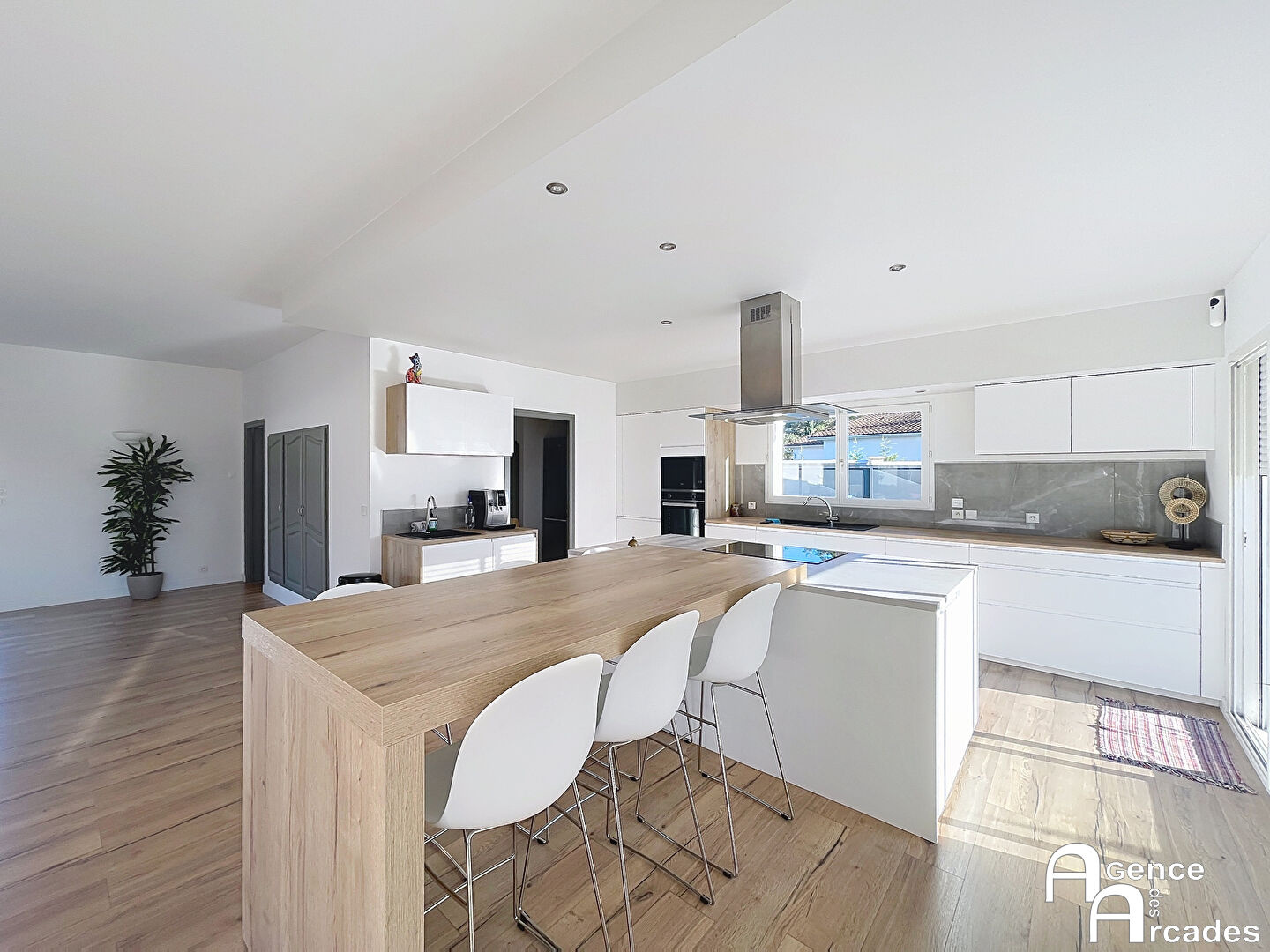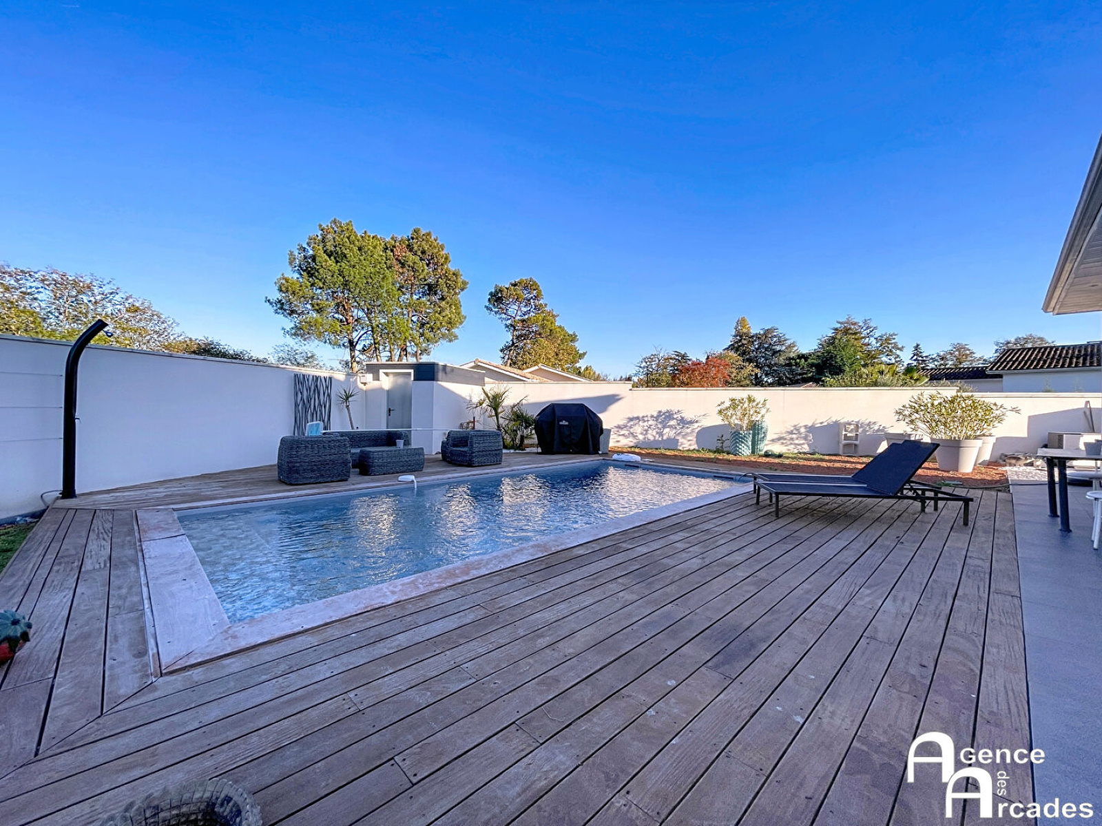 SUPERBE MAISON CONTEMPORAINE de 228 m² avec piscine. Vous recherchez le confort, l'espace et la tranquillité ? Laissez-vous séduire par cette magnifique maison contemporaine, entièrement rénovée en 2023, offrant des prestations haut de gamme et un cadre de vie exceptionnel. Dès l'entrée, spacieuse et élégante, le ton est donné : volumes généreux et lumière omniprésente. Le vaste espace de vie de près de 100 m² accueille un salon convivial avec sa cave murale intégrée, un séjour lumineux, une cuisine ouverte moderne et fonctionnelle ainsi qu'un cellier attenant pour plus de praticité. Côté nuit, la maison dispose de quatre chambres, dont une suite parentale avec salle d'eau privative et dressing, une salle de bains, plusieurs toilettes. Cette habitation possède de nombreux équipements dernière génération : pompe à chaleur air/eau pour un confort optimal, menuiseries aluminium double vitrage, volets roulants électriques avec domotique, alarme et portail motorisé pour la sécurité et le confort. À l'extérieur, profitez d'un terrain clos de 1000 m² environ, parfaitement arboré avec ses oliviers et sa piscine chauffée au sel. Les pelouses sont entretenues par deux robots tondeuses et plusieurs celliers extérieurs permettent le rangement du matériel et des outils. Le tout dans un environnement calme et agréable, en deuxième ligne, sans aucun vis-à-vis. Un bien rare, alliant modernité, confort et sérénité, idéal pour une famille ou pour recevoir en toute convivialité. Coup de coeur assuré. ARCADES PROPRIETES.
