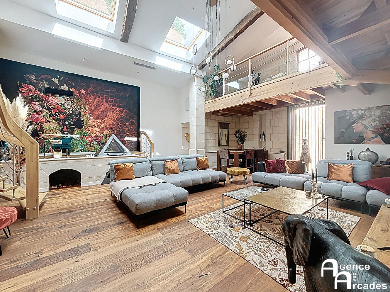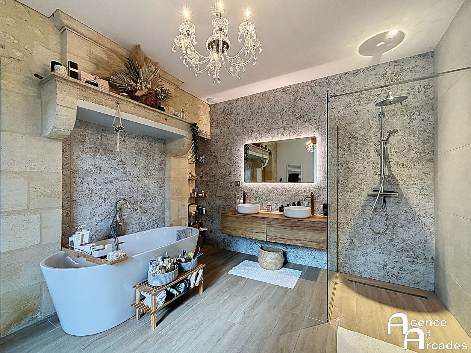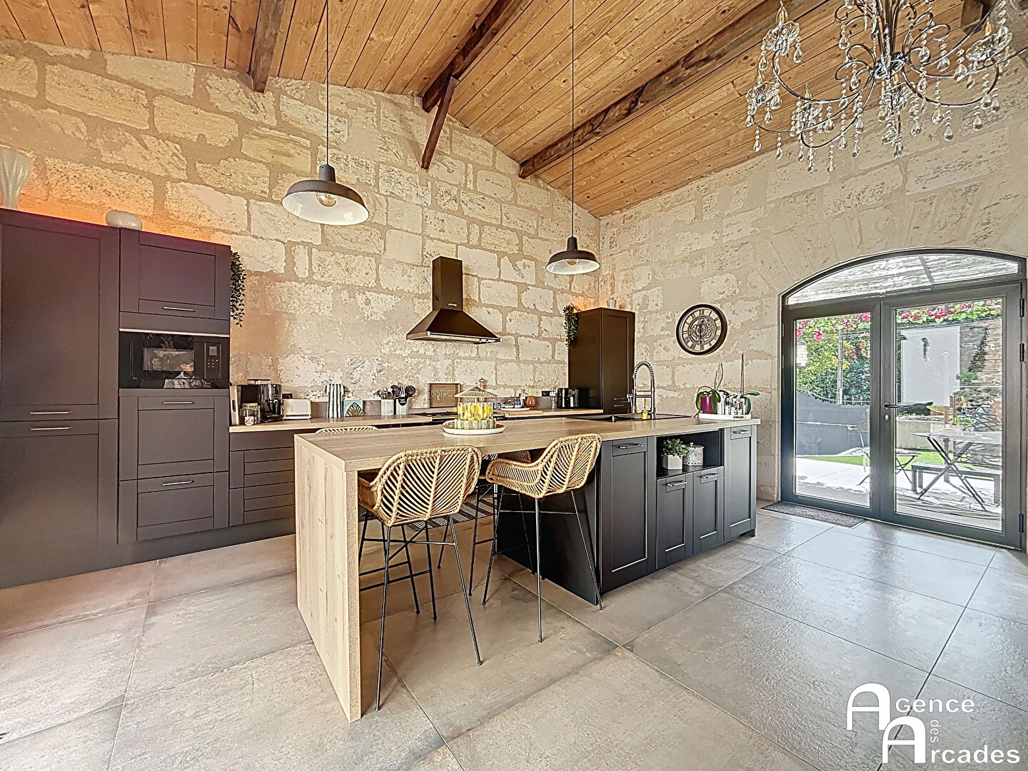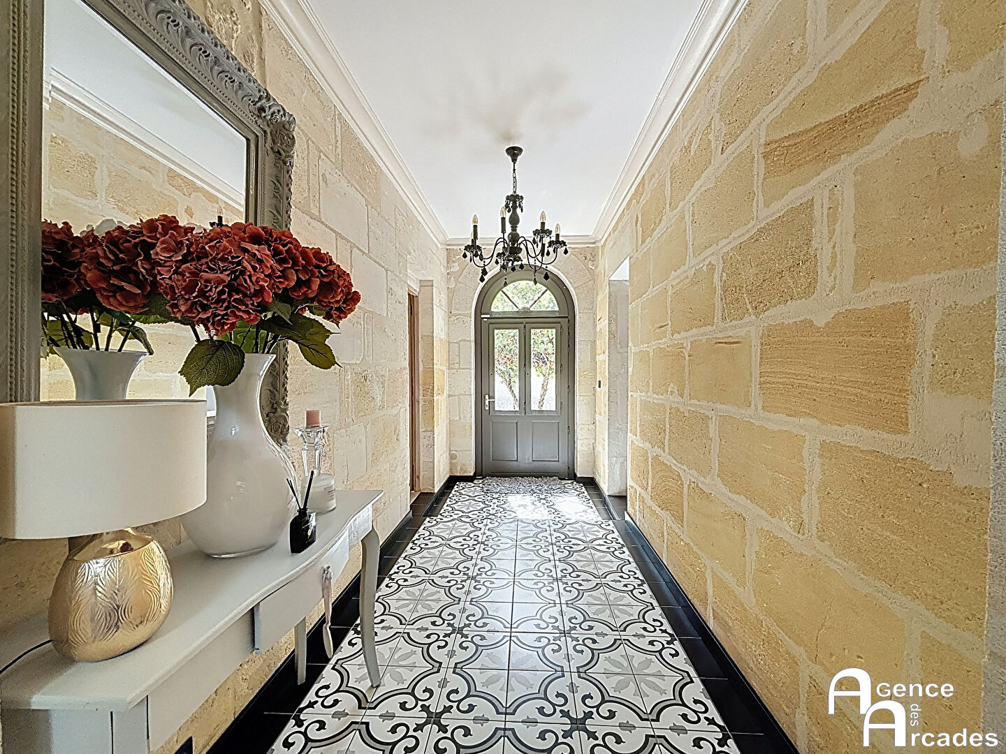 A seulement 20 mn de BORDEAUX - Elégante bâtisse en pierre d'environ 215 m² entièrement rénovée de matériaux et de prestations de grandes qualités. Alliant charme et modernité, offrant un cadre de vie exceptionnel et situé au coeur d'un environnement calme et recherché, ce bien est composé d'une entrée d'envergure menant sur un vaste salon-salle à manger lumineux à la décoration raffinée. Celui-ci est suivi d'une grande cuisine desservant deux terrasses dont l'une ouvre sur un jardin bucolique et atypique laissant découvrir son lavoir ainsi qu'une carrière souterraine. Une magnifique suite parentale retirée complète cet espace en rez-de-chaussée. L'étage comprend un vaste patio qui surplombe la pièce de vie laissant admirer le raffinement de la pièce. Deux grandes suites indépendantes avec salle d'eau privatives complètent l'espace nuit. Un piscine hors-sol magnifiquement mise en en valeur au style balinais complète ce bien au style unique faisant de lui un bien rare. Proche des commerces et de toutes commodités - AGENCE DES ARCADES