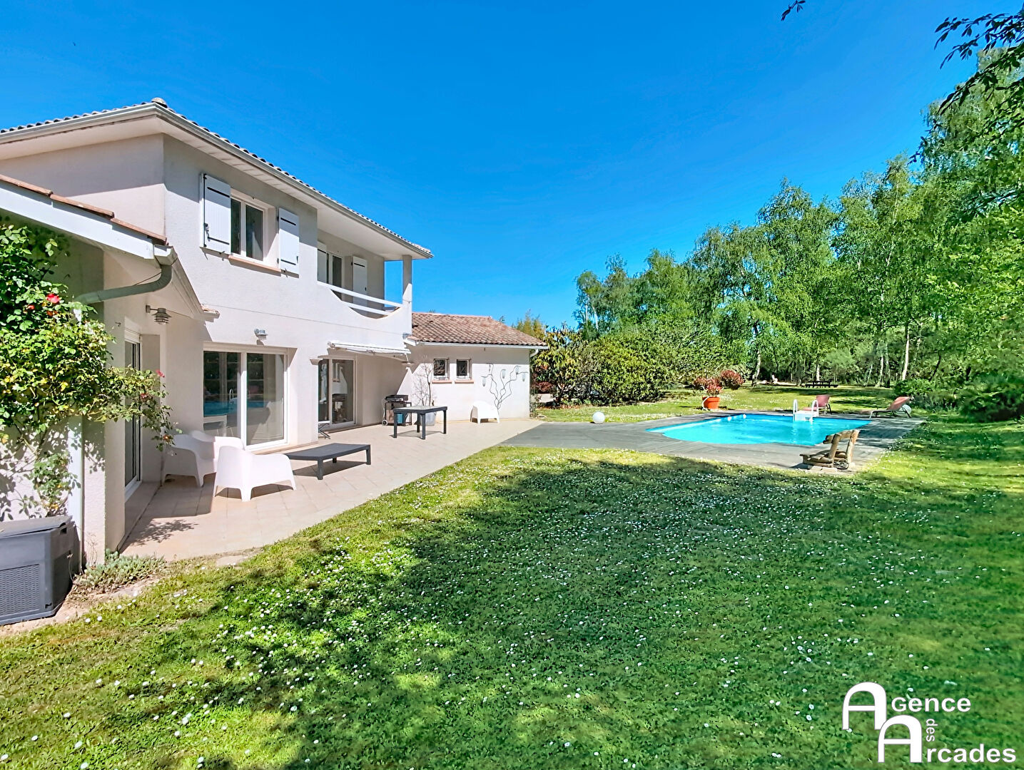 MAISON EN PIERRE DE MOELLONS de plus de 160m² comprenant une pièce de vie avec une salle à manger, un salon de 60m² avec cheminée et poutres apparentes, cuisine attenante donnant sur une terrasse, un cellier, une chambre, une salle de bains avec baignoire ainsi qu'une salle de jeux complète le rez-de-chaussée. A l'étage vous disposerez de deux chambres et une petite chambre mansardée, un espace mezzanine ainsi qu'une salle d'eau avec une douche. Le jardin d'environ700m² est arboré et clôturé, un carport de 50m² une cave et un grenier complète ce bien. Maison parfaitement entretenue et en excellent état. Située à 20 minutes de Bordeaux, et à 5 minutes de l'accès à la voie rapide N89 Bordeaux. AGENCE DES ARCADES